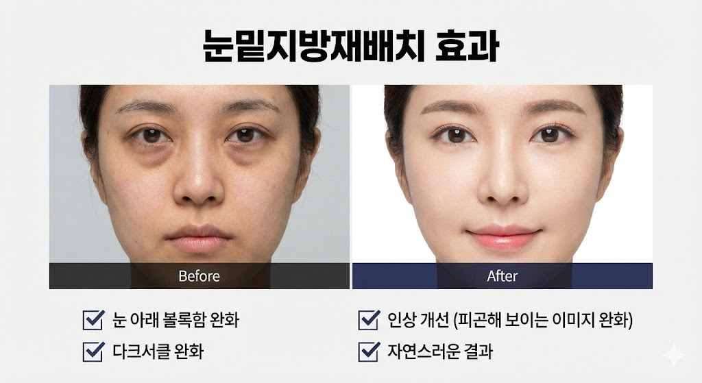 눈 아래가 불룩하게 튀어나오거나 그늘처럼 어두워 보이면 실제 나이보다 더 피곤해 보일 수 있습니다. 이런 고민을 해결하기 위해 많이 알아보는 방법이 눈밑지방재배치입니다. 단순히 지방을 제거하는 것이 아니라, 울퉁불퉁한 지방을 고르게 이동시켜 자연스럽게 정리하는 방식입니다. 이번 글에서는 눈밑지방재배치 효과, 비용, 회복기간, 부작용, 대상까지 한 번에 정리해 드립니다.