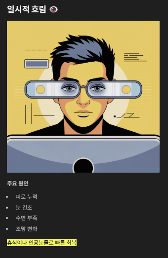 눈이 일시적으로 뿌옇게 보이는 경우는 주로 피로, 건조, 수면 부족, 조명 변화가 원인입니다.
