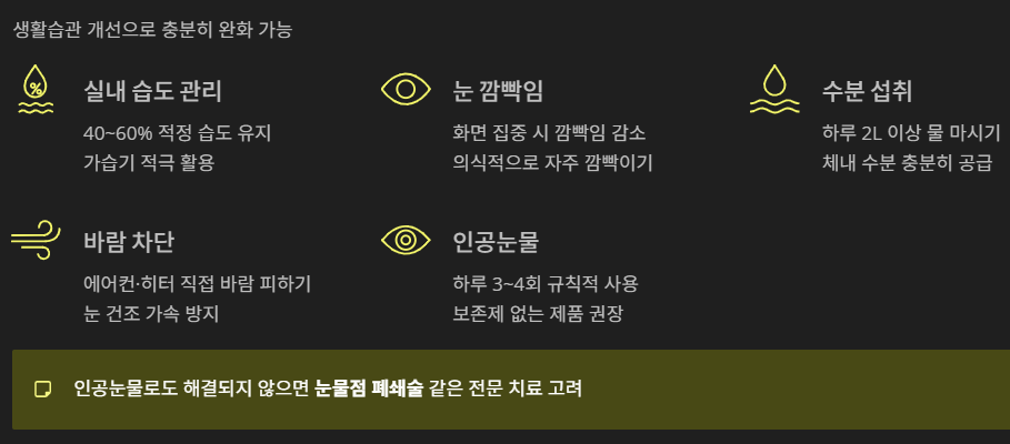만약 인공눈물로도 해결되지 않는다면, 눈물점 폐쇄술 같은 치료가 필요할 수도 있습니다.