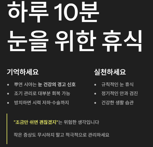 눈은 한번 손상되면 회복이 어렵기 때문에, 작은 습관 변화가 가장 큰 예방책이 됩니다.