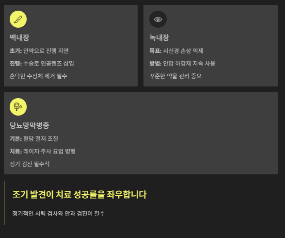 이러한 질환은 초기 발견이 치료 성공률을 좌우하므로, 정기적인 시력 검사와 안과 검진이 필수입니다.