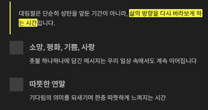 | 1주차 | 보라 | 소망 | 어둠 속에서도 빛을 기다리는 마음 |