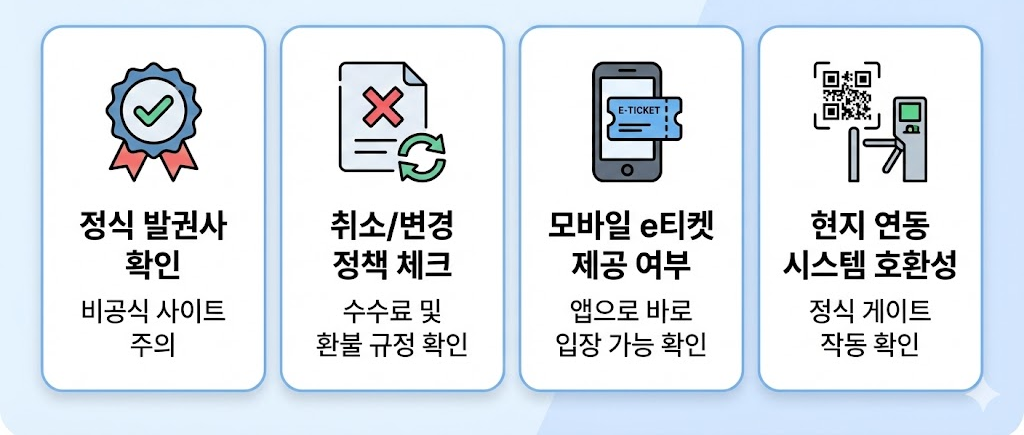 - 신용카드 또는 현지 결제 수단 입력 → 모바일 티켓 수신