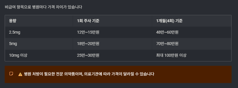 | 2.5mg | 약 12만~15만원 | 약 48만~60만원 |