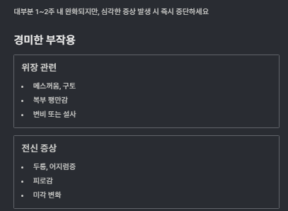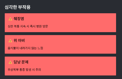 | 구분 | 경미한 부작용 | 심각한 부작용 |