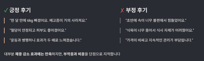 대부분의 후기는 체중 감소 효과에는 만족하지만, 부작용과 비용 문제를 단점으로 꼽았다.