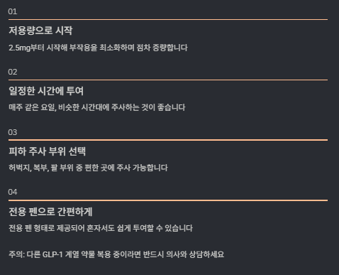 주의: 이미 다른 GLP-1 계열 약물을 복용 중이라면 의사 상담 후 조정해야 한다.