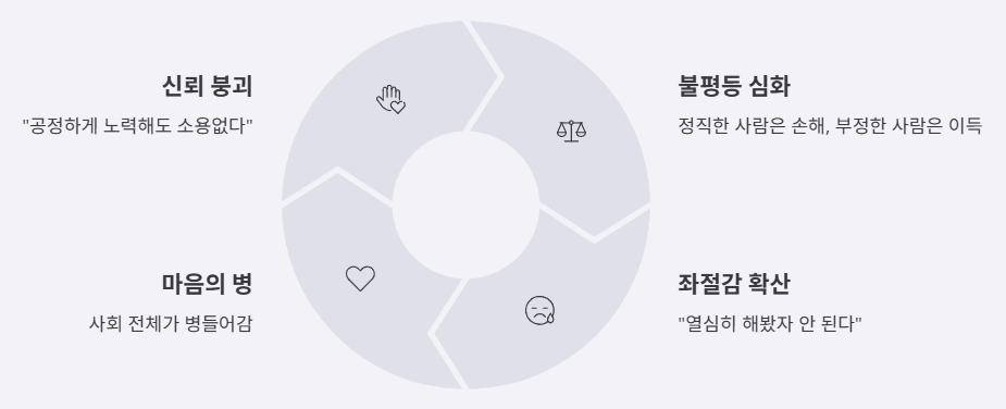 이런 일이 반복되면 사람들은 “공정하게 노력해도 소용없다”는 생각을 하게 됩니다.