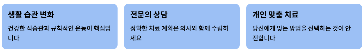 무엇보다 중요한 것은 약물에만 의존하지 않고 생활 습관 변화와 건강한 식습관을 함께 유지하는 것입니다.