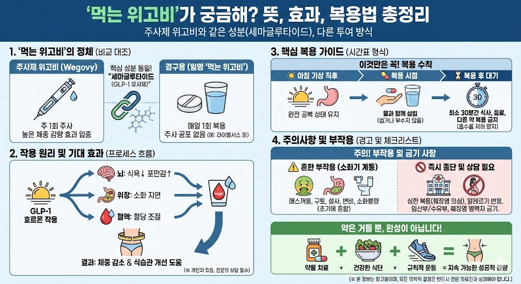 먹는 위고비(oral semaglutide) 계열 약물은 주사형 Wegovy와 달리 주사 공포가 없는 장점이 있지만, 효과나 개인 반응은 사람마다 다를 수 있습니다.