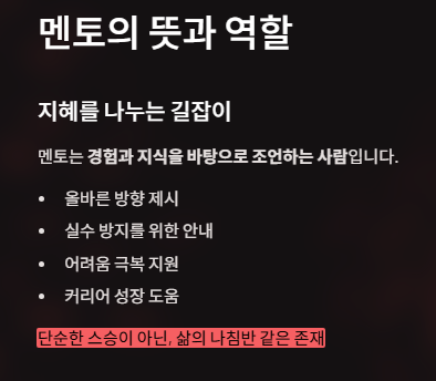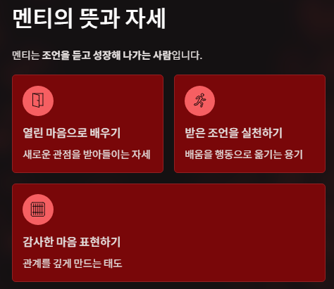 경험을 나누면서 멘티가 실수하지 않도록 돕고, 어려움을 겪을 때 길잡이처럼 방향을 제시하는 사람입니다. 단순한 스승이 아니라, 삶의 나침반 같은 존재라고 할 수 있습니다.