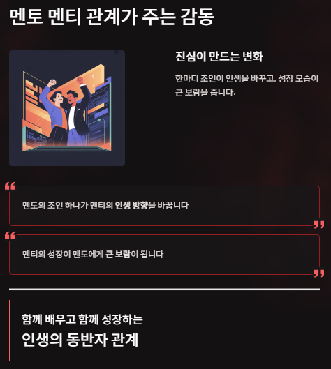 진심 어린 조언과 응원은 사람의 마음을 움직입니다. Mentor 의 한마디가 Mentee 의 인생을 바꿀 수도 있고, Mentee 의 성장 모습이 멘토에게도 큰 보람이 됩니다.
