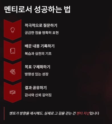 멘티는 단순히 도움을 받는 역할에 머무르지 않고, 적극적으로 질문하고 배움을 실천해야 합니다.