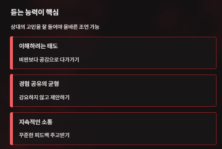 단순히 ‘조언을 주는 사람’이 아니라, 듣는 능력이 좋은 사람이어야 합니다. 상대가 어떤 고민을 하는지 잘 들어야 올바른 조언을 줄 수 있기 때문입니다.