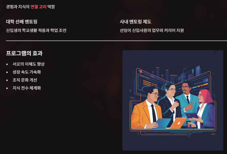 이러한 프로그램은 경험과 지식의 연결 고리 역할을 하며, 서로의 이해를 높이고 성장 속도를 빠르게 만들어줍니다.