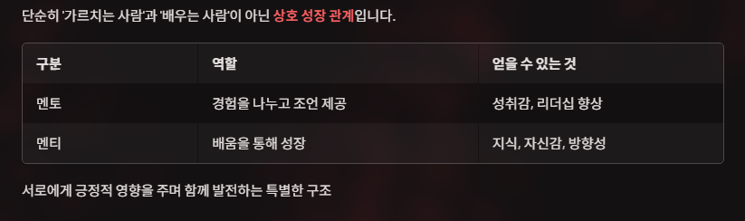 | Mentee | 배움을 통해 성장 | 지식, 자신감, 방향성 |