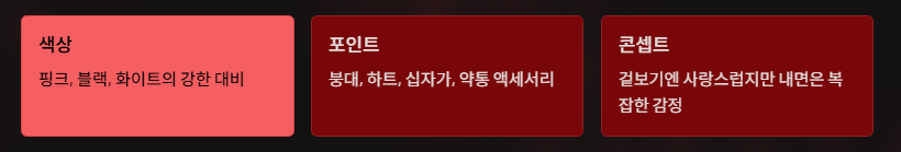 | 색상 | 핑크, 블랙, 화이트의 강한 대비 |