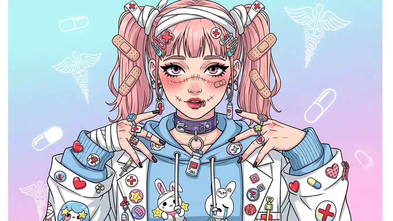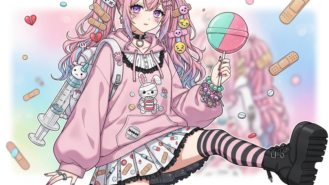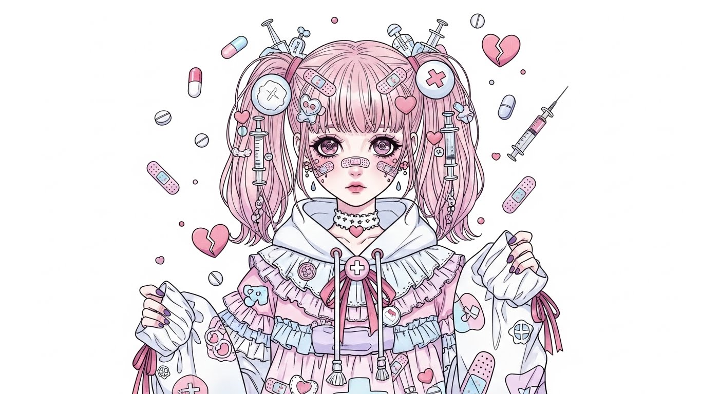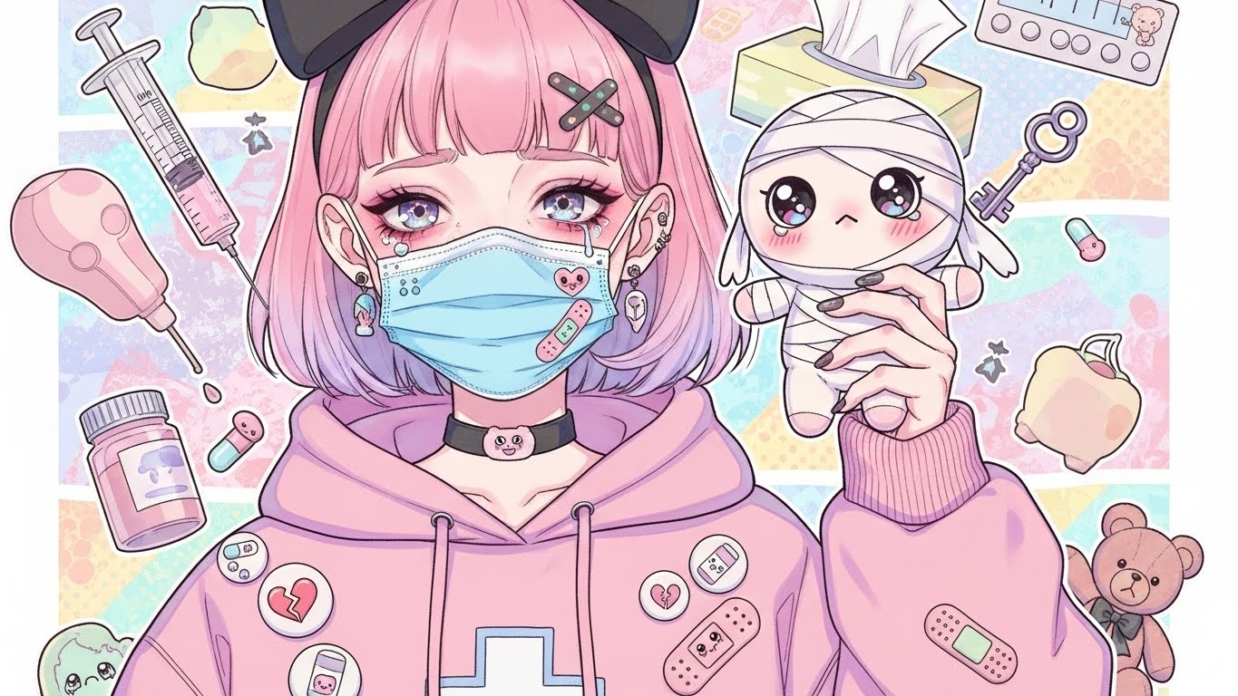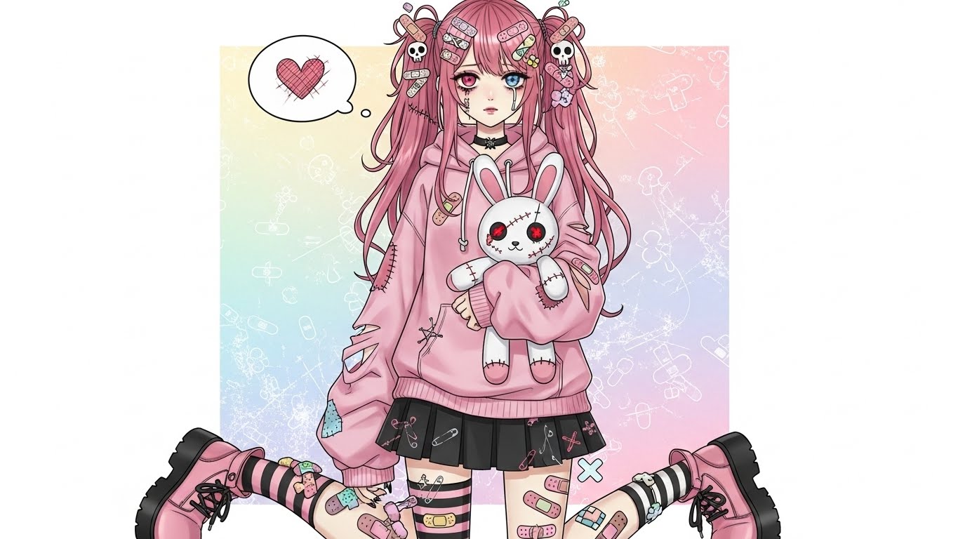 A. 핑크, 블랙, 화이트 등 감정적인 색 조합에 리본, 붕대, 하트 같은 소품을 활용해 귀엽지만 어두운 감정을 표현하는 스타일입니다.