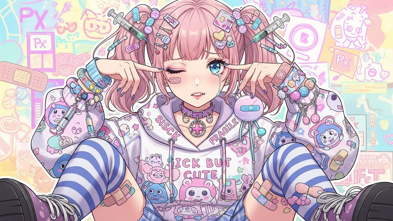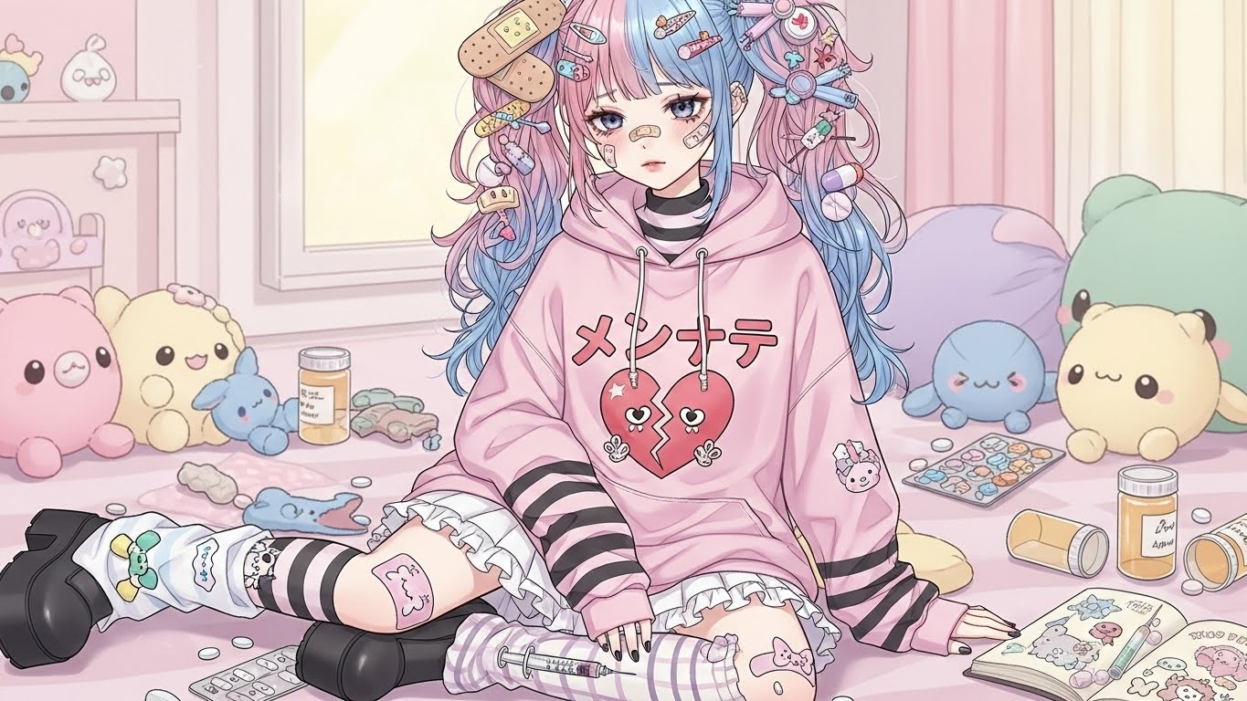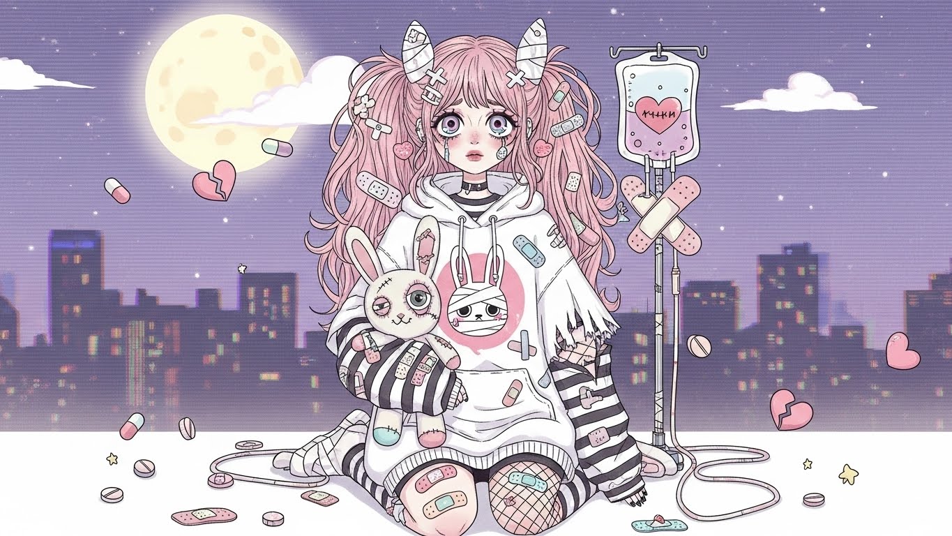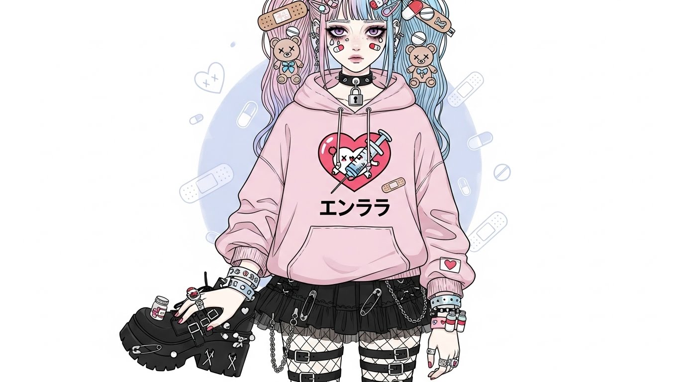 A. 핑크, 블랙, 화이트 등 감정적인 색 조합에 리본, 붕대, 하트 같은 소품을 활용해 귀엽지만 어두운 감정을 표현하는 스타일입니다.
