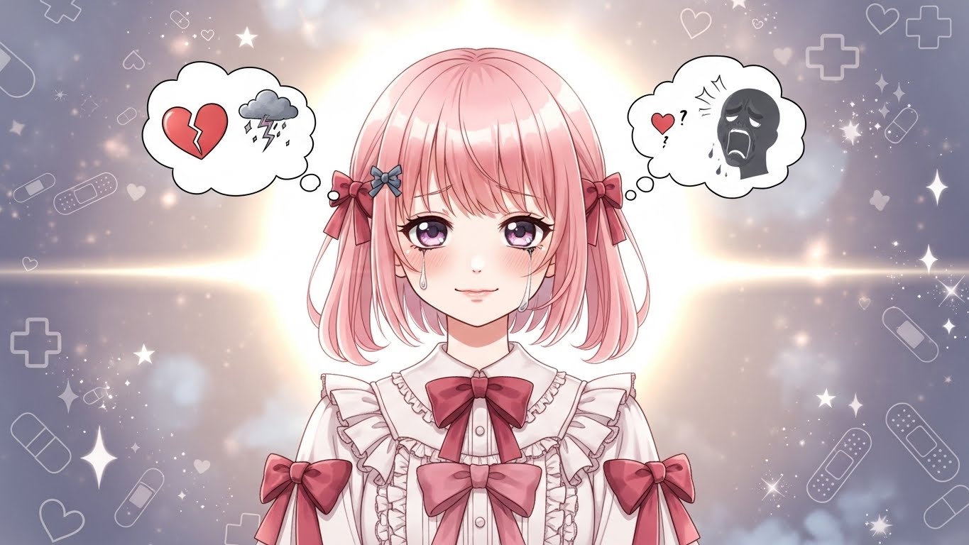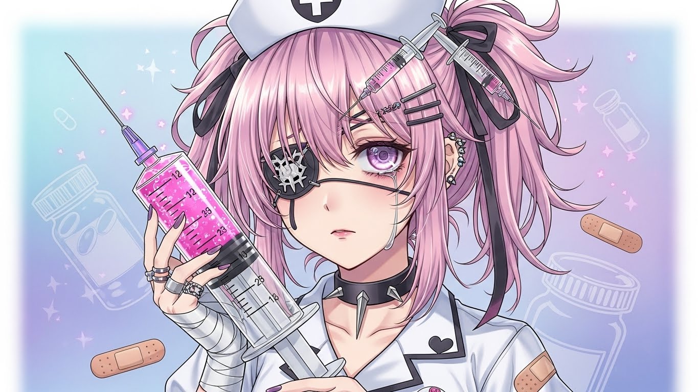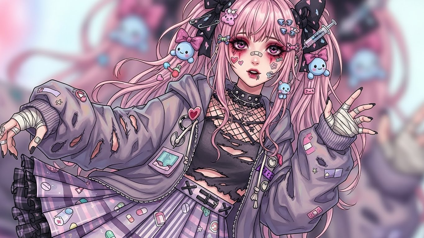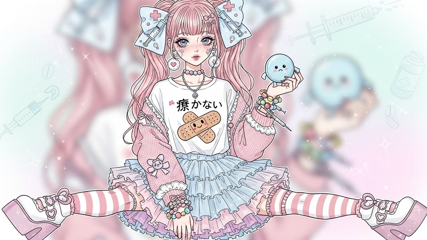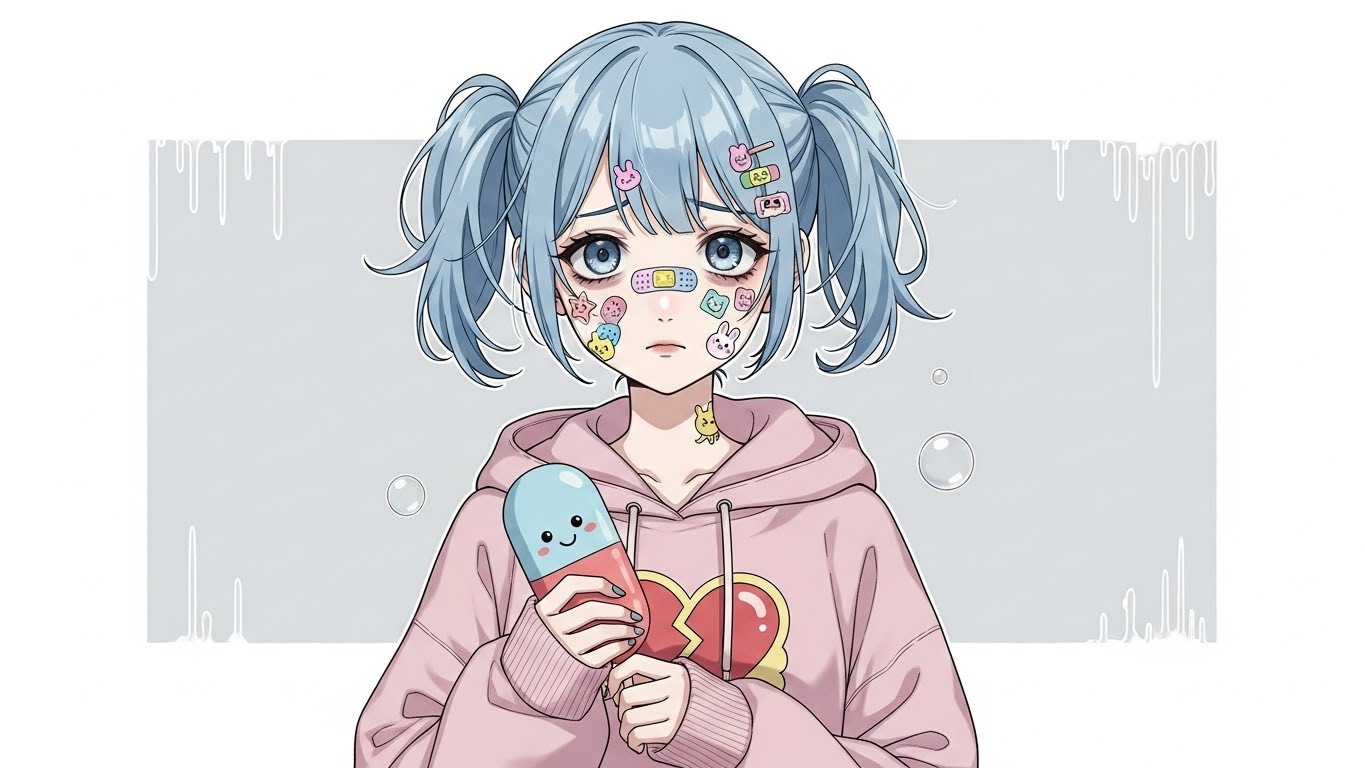 A. 핑크, 블랙, 화이트 등 감정적인 색 조합에 리본, 붕대, 하트 같은 소품을 활용해 귀엽지만 어두운 감정을 표현하는 스타일입니다.