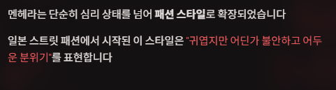 - 멘헤라 감성 → 내면의 불안, 외로움, 솔직함