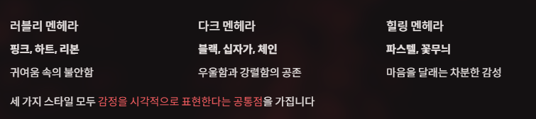 | 다크 멘헤라 | 블랙, 십자가, 체인 | 우울함과 강렬함의 공존 |