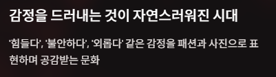 ‘힘들다’, ‘불안하다’, ‘외롭다’ 같은것을 패션과 사진으로 표현하며 공감받는 문화가 형성된 것이죠.