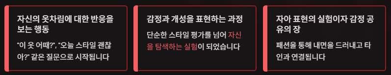 자신의 감정과 개성을 옷으로 표현하고 반응을 통해 자신을 탐색하는 과정으로 발전했습니다.
