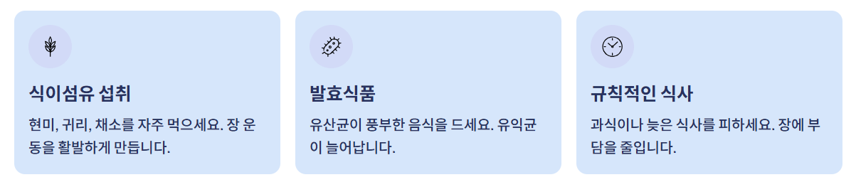 • 식이섬유가 풍부한 식품(현미, 귀리, 채소)을 자주 섭취