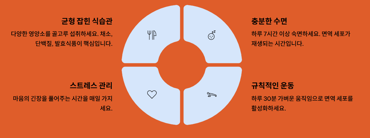 면역력은 하루아침에 생기지 않습니다. 몸의 균형, 마음의 안정, 그리고 꾸준한 습관이 합쳐져야 비로소 강한 방어 체계가 만들어집니다. 오늘부터 식습관, 수면, 운동, 스트레스 관리 중 단 한 가지라도 꾸준히 실천해보세요. 작은 변화가 쌓이면, 감기 한 번 안 걸리는 튼튼한 몸으로 바뀔 거예요.