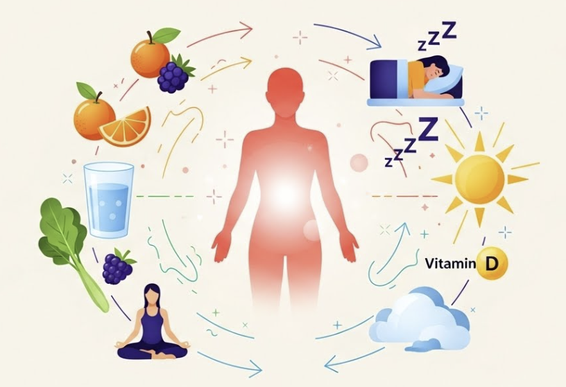충분한 수면은 면역력 유지의 기본입니다. 밤 11시부터 새벽 3시 사이에는 면역 세포가 가장 활발히 재생되기 때문에 하루 최소 7시간 이상 숙면하는 것이 좋습니다. 스트레스를 줄이는 것도 중요합니다. 지속적인 긴장은 코르티솔 수치를 높여 면역 기능을 떨어뜨립니다. 명상, 가벼운 산책, 심호흡, 음악 감상 등으로 마음의 긴장을 풀어주는 시간을 갖는 것이 좋습니다.