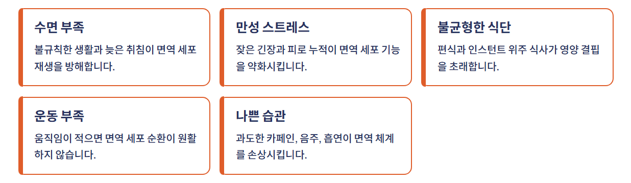 우리 몸의 면역 체계는 꾸준히 관리하지 않으면 쉽게 무너집니다. 다음과 같은 습관이 면역력 저하의 주된 원인이 됩니다.