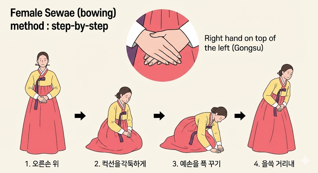 명절 세배 손위치의 핵심은 남자는 왼손 위, 여자는 오른손 위라는 점입니다. 절을 할 때는 천천히 움직이고 단정한 자세를 유지합니다. 형식보다 중요한 것은 존중의 마음입니다.