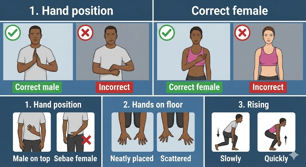 이때 손은 바닥에 가지런히 놓아야 합니다. 일어날 때도 급하게 움직이지 않고 천천히 올라오는 것이 예의에 맞습니다.