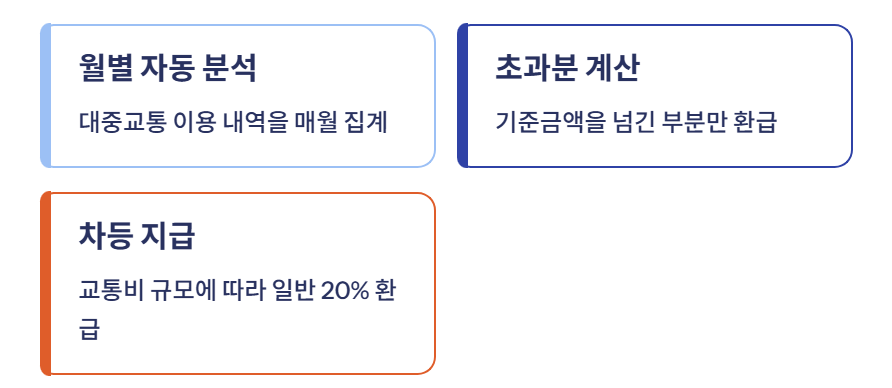 매월 대중교통 이용 내역을 자동 분석하여 일정 기준금액을 초과한 부분을 돌려줍니다.