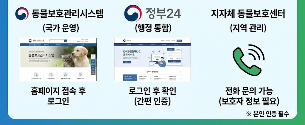 조회는 농림축산식품부에서 운영하는 동물보호관리시스템에서 가능하다. 공식 홈페이지에 접속하면 확인할 수 있다.