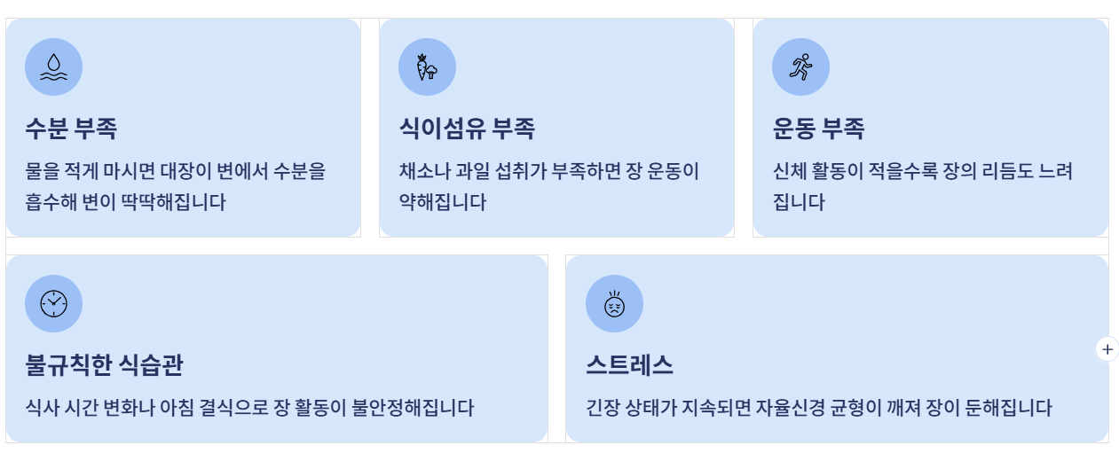 - 운동 부족 : 신체 활동이 적을수록 장의 리듬도 느려집니다.