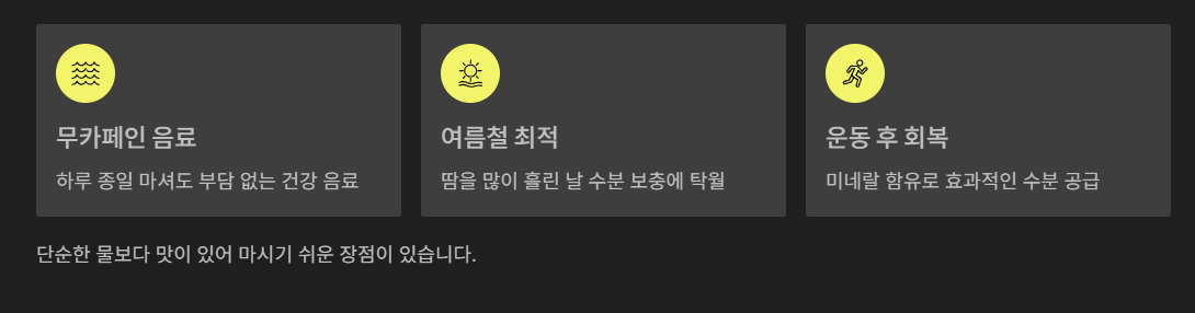 | 수분 공급 | 물처럼 마시기 좋고 갈증 해소에 탁월 |
