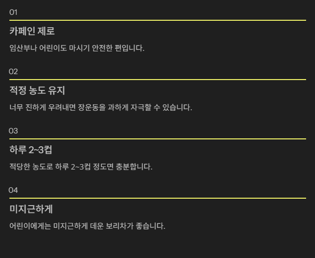 카페인이 없어 어린아이도 마시기 적합한 음료입니다. 하지만 너무 진하게 끓이면 장에 자극이 될 수 있으므로 연하게 우려내는 것이 좋아요. 하루 1~2잔 정도면 충분하며, 특히 미지근하게 데워서 주는 것이 안전합니다.