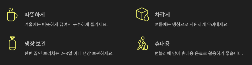 A. 따뜻하게 또는 시원하게 마실 수 있고, 요리에 넣거나 외출 시 텀블러에 담아 활용하는 등 다양한 방식으로 즐길 수 있습니다.