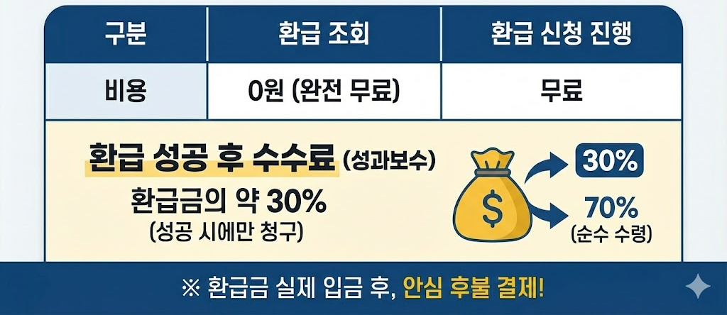 조회는 무료지만, 실제로 환 급 신청을 진행해 환 급금이 입금될 경우에만 수수료가 발생합니다. 쉽게 말해 성과보수 방식이에요.