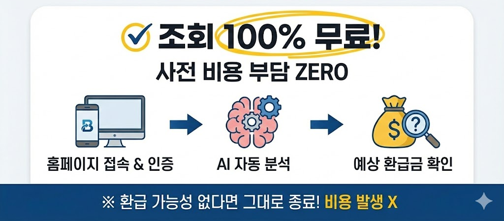 이 모든 과정은 무료로 제공되며, 환 급 가능성이 없다면 그대로 종료해도 아무런 비용이 발생하지 않습니다. 부담 없이 ‘나도 혹시 받을 수 있나?’ 라는 궁금증을 해결할 수 있다는 게 큰 장점이에요.