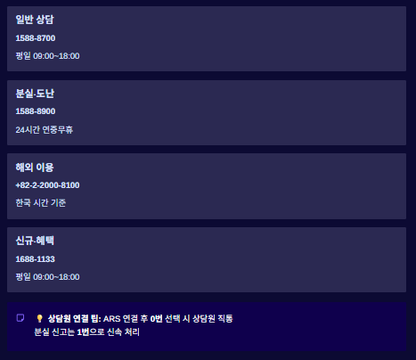 | 분실·도난 | 1588-8900 | 24시간 가능 |