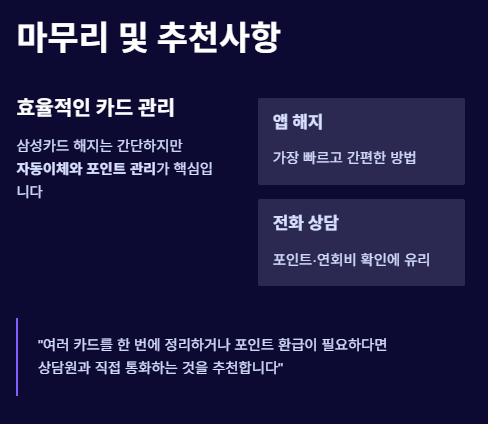 삼성카드 해지 절차는 비교적 간단하지만, 자동이체와 포인트 관리를 놓치면 불편이 생길 수 있다. 특히 여러 카드가 연결된 경우, 한 번의 상담으로 모두 정리하는 것이 효율적이다. 개인적으로는 앱을 통한 해지가 가장 빠르고 간단했지만, 포인트 환급이나 연회비 확인을 위해 상담원과 직접 통화하는 것을 추천한다.