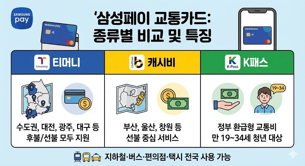 삼성페이 교통카드는 티머니(Tmoney) 또는 캐시비(Cashbee)를 기반으로 하는 모바일 교통 결제 서비스입니다.