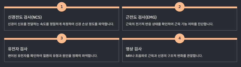 샤르코마리투스병을 정확히 진단하기 위해서는 다음과 같은 검사를 시행한다.