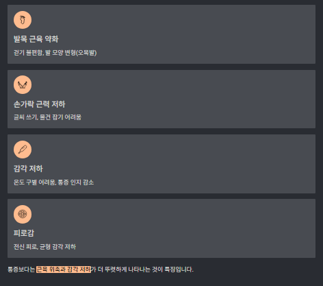 이 질환은 통증보다는 근육 위축과 감각 저하가 더 뚜렷하게 나타난다.
