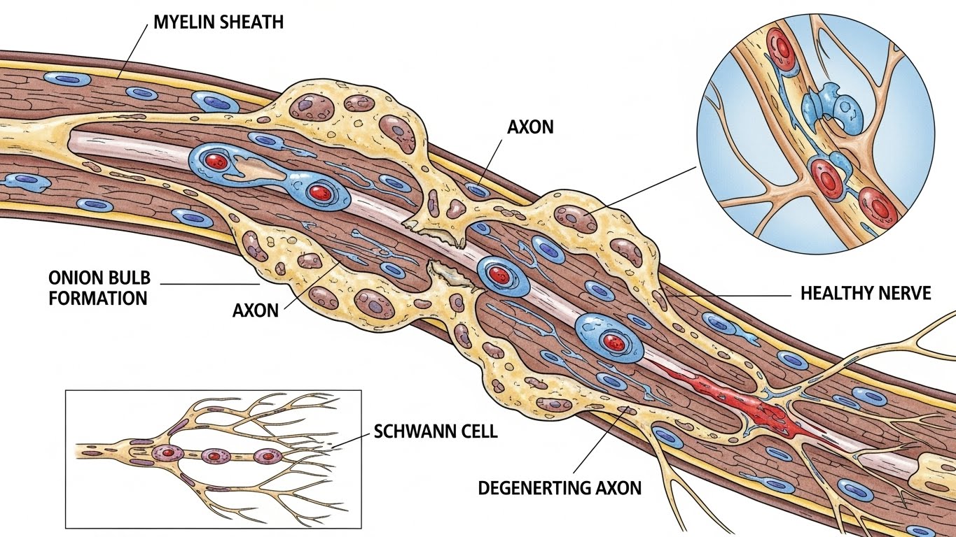 이 병은 유전자 돌연변이로 인해 신경의 수초(신경을 감싸 보호하는 막)가 손상되면서 생긴다.