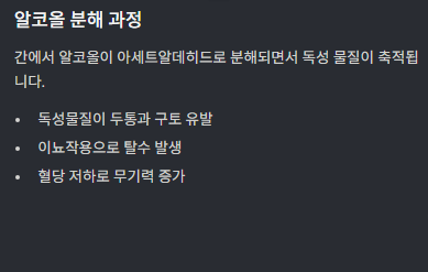 알코올은 간에서 아세트알데히드라는 물질로 바뀝니다. 이 물질이 제대로 분해되지 않으면 두통, 구토, 갈증, 피로가 생깁니다. 또, 술은 이뇨작용을 일으켜 수분과 전해질이 빠져나가 탈수를 유발합니다.