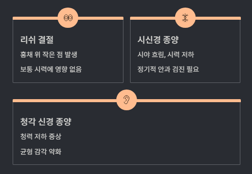 눈에는 리쉬 결절(Lisch nodule)이라 불리는 작은 점이 홍채 위에 생길 수 있습니다. 보통 시력에 영향을 주지 않지만, 시신경에 혹이 생기면 시야가 흐릿해지거나 시력 저하가 발생합니다. 또한, 신경섬유종 2형의 경우에는 귀의 신경에 혹이 생겨 청력이 떨어지거나 균형 감각이 약해지는 증상이 생깁니다.